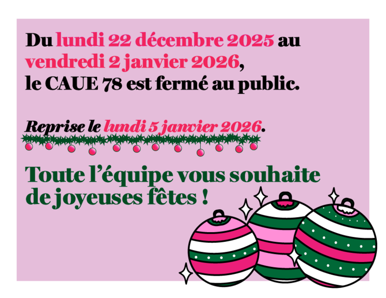 Durant les fêtes, le CAUE des Yvelines fermera ses portes au public du 22 décembre 2025 au 2 janvier 2026.
